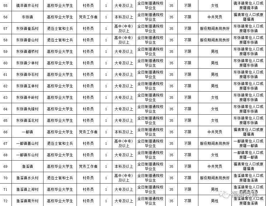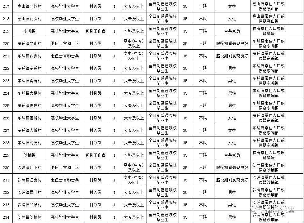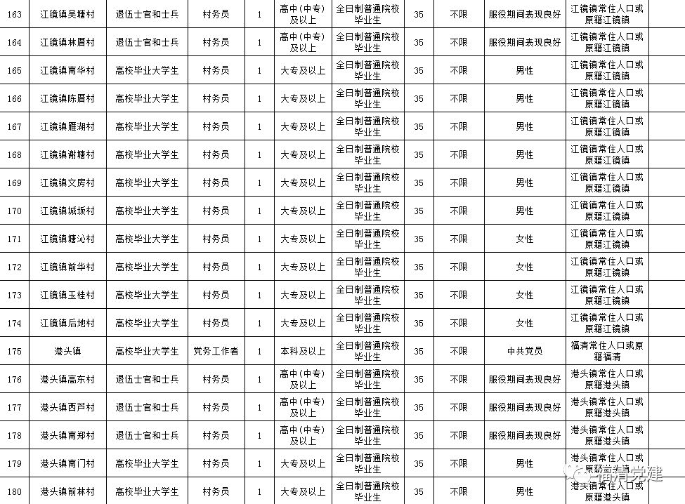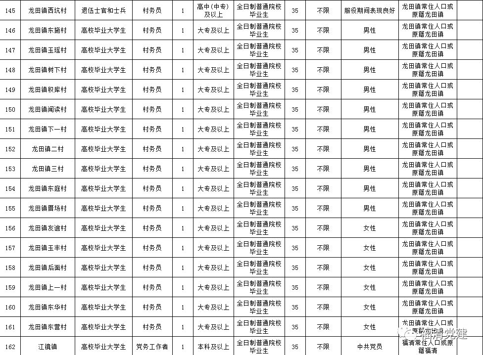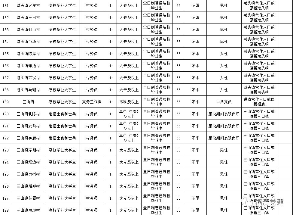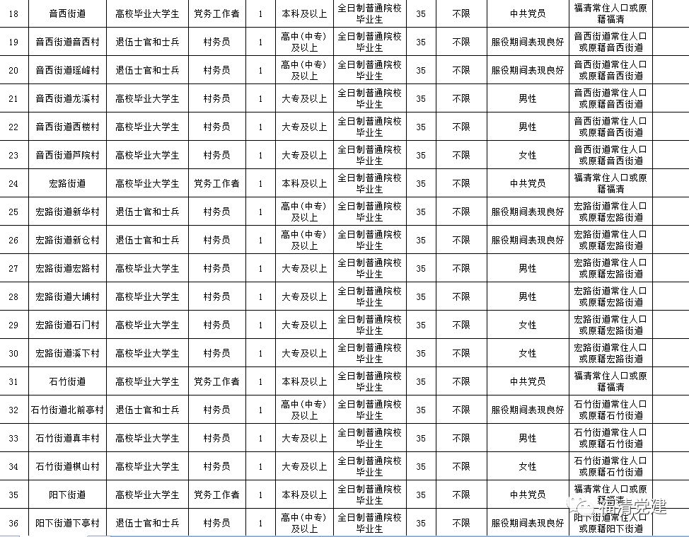 | 为贯彻落实党的十九大精神,实施乡村振兴战略,培养和造就一支懂农业、爱农村、爱农民的人才队伍,进一步优化村级干部队伍结构,提升整体素质,根据福州市委“五个一千”人才行动计划,结合我市实际,开展公开选聘村务工作者工作,全市拟选聘村务工作者242名(其中:党务岗位27名,村务岗位215名),现将有关情况公告如下 报名条件1.政治素质好,坚决拥护党的领导,遵守宪法和法律规定;2.具备良好的品行和职业道德;3.服务意识好,具有一定的组织、管理、协调能力;4.具有正常履行职责的身体条件;5.年龄为18周岁以上、35周岁及以下(即1983年8月28日至2000年8月28日期间出生),全日制硕士研究生及以上学历的,最高年龄可放宽到40周岁;6.具备办公自动化知识,如计算机基本操作和Word、Excel等办公软件使用等技能;7.计生、综治、诚信等情况符合有关政策规定。(报考单位、岗位、人数及具体要求详见《福清市“一懂两爱”专职村务工作者选聘职位表》)曾因犯罪受过刑事处罚的、曾被开除公职的、因个人原因受过纪律处分影响期未满的、现役军人以及有法律法规规定不得聘用的其他情形人员,不得报考。在职人员应提供所在单位及主管部门同意其报考、同意辞职或已解除聘用(劳动)合同的证明。毕业证书、资格证书等相关资格条件,截止日期为报名结束之日,并应在报名时提交。报考程序由市委组织部、市人力资源和社会保障局统一公开选聘,经资格预审、笔试、面试、体检、考察等程序后择优聘用。报考人员成绩按选聘岗位的人员类型分别计算排名。具体流程如下: (一)报名采取现场公开报名方式,每人限报一个岗位。报考对象须持本人身份证、户口簿、毕业证书、退伍军人相关证明材料、经报考单位所在镇街党(工)委初审并盖章确认的《福清市“一懂两爱”专职村务工作者报名表》(以下简称报名表)、近期同底1寸免冠彩色相片1张及其他需要提供的证明材料,到指定的报名点报名(证件需提供原件、复印件)。报考对象为在职人员,需提供由单位及主管部门出具的同意报名证明。 报名时间:2018年8月22日-2018年8月28日(含节假日,上午8:00-12:00,下午15:00-18:00) 报名地点:福清市人力资源和社会保障局7层会议室(福清市向高街人才大楼7层) 咨询电话:0591-85220836 资格审查:选聘岗位所在镇街对报考对象提供的相关材料进行资格初审,不符合条件者,取消报考资格。初审通过后,由报考对象到指定地点进行现场报名和资格复核。市人力资源和社会保障局适时在福清人事人才网(www.fqrsw.com)上公布复核结果。报考对象应严格按选聘岗位的资格条件要求报名,并对提交的信息和材料真实性负责,凡发现弄虚作假的,一经查实,即取消考试或聘用资格。情节严重的,追究相关责任人责任。 报考人员现场报名后,工作人员即向报考人员提供报名序号。报考人员获取报名序号后,将《报名表》电子档和近期同底1寸免冠彩色相片电子档发送到指定邮箱:fqrcgz@qq.com。《报名表》为.xls格式,以“报名序号+姓名+身份证号码”命名;相片为.jpg格式,以“报名序号+姓名+身份证号码”命名。 (二)笔试1.笔试主要内容为农村工作知识、办公自动化知识(计算机基本操作和Word、Excel等办公软件使用)等。其中,农村工作知识参考资料为:党的十九大报告,《中国共产党章程》《中国共产党农村基层组织工作条例》《中华人民共和国村民委员会组织法》《福建省实施<中华人民共和国村民委员会组织法>办法》《中共中央 国务院关于实施乡村振兴战略的意见》,以及其他与农业、农村相关的知识等。若岗位报考人数不足3人的,经市公开选聘“一懂两爱”村务工作者工作领导小组研究同意后,可以开考。2.笔试时间、地点将在准考证上注明,准考证发放时间、地点另行通知。3.笔试成绩及笔试成绩合格线在福清人事人才网上公布。 (三)面试根据报考对象笔试成绩从高分到低分排列顺序,按岗位拟选聘人数1:3比例确定面试人选。若岗位报考人数不足3人的(不含3人,下同),按达到笔试成绩合格线的实有笔试人数确定面试人选。进入面试的报考对象笔试成绩末位并列者,均列入面试人选。弃权面试的空额优先从本岗位报名对象中递补;若本岗位无递补人员,党务岗位的空额从全市其他同类型服从岗位调剂的报名对象中按笔试成绩高低顺序依次递补,村务岗位的空额从本镇街其他同类型服从岗位调剂的报考对象中按笔试成绩高低顺序依次递补。面试成绩合格线为60分;当岗位面试人数少于3人时,考生面试成绩须不低于70分。笔试成绩与面试成绩各占综合成绩的50%权重。 (四)体检与考察根据报考对象综合成绩从高分到低分排列顺序,按岗位拟选聘人数1:1比例确定体检考察对象。综合成绩相同的,以笔试成绩高低排序,笔试成绩高的确定为体检考察对象。 体检标准及项目参照《公务员录用体检通用标准(试行)》执行。体检医院应是指定的县级以上综合性医院。体检医院应根据体检标准出具结论。考生若对体检结论有异议的,可在体检结论公布后3个工作日内向中共福清市委组织部、市人力资源和社会保障局提出。 体检合格者确定为考察对象,体检不合格者或不参加体检者取消聘用资格。市公开选聘“一懂两爱”村务工作者工作领导小组组织人员对考察对象的政治思想表现、道德品质、业务能力、工作经验等情况进