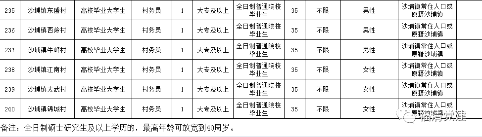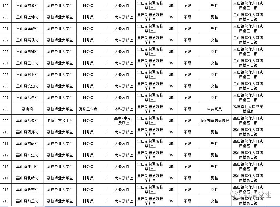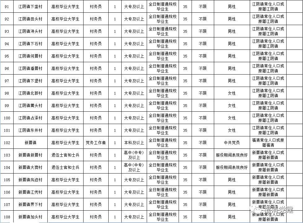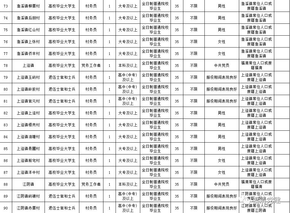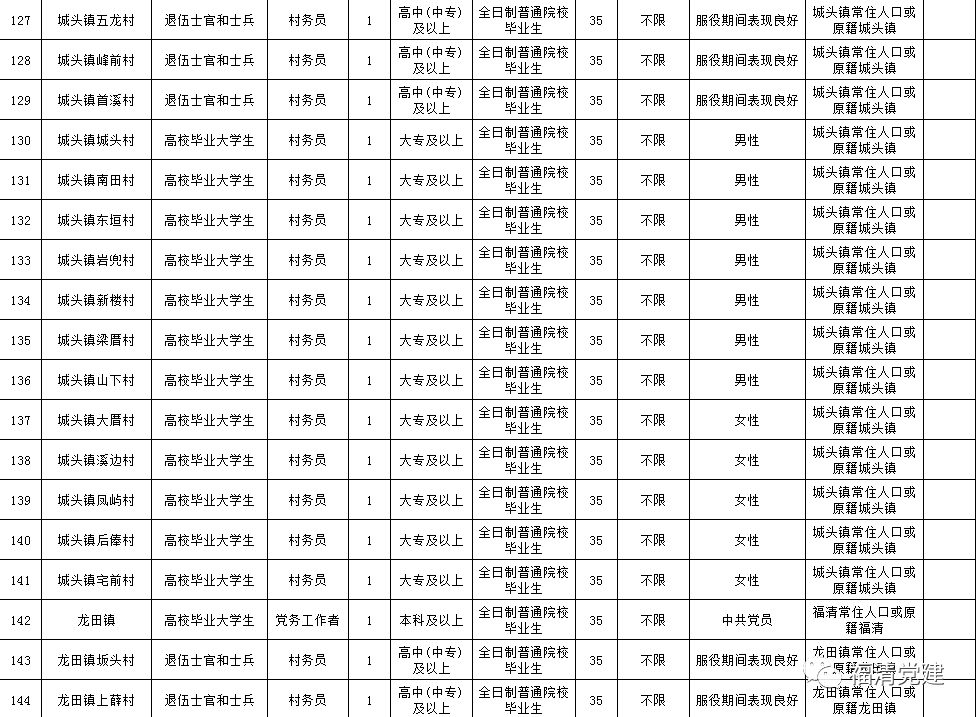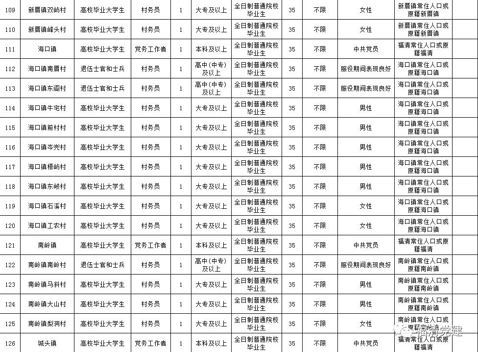 | 为贯彻落实党的十九大精神,实施乡村振兴战略,培养和造就一支懂农业、爱农村、爱农民的人才队伍,进一步优化村级干部队伍结构,提升整体素质,根据福州市委“五个一千”人才行动计划,结合我市实际,开展公开选聘村务工作者工作,全市拟选聘村务工作者242名(其中:党务岗位27名,村务岗位215名),现将有关情况公告如下 报名条件1.政治素质好,坚决拥护党的领导,遵守宪法和法律规定;2.具备良好的品行和职业道德;3.服务意识好,具有一定的组织、管理、协调能力;4.具有正常履行职责的身体条件;5.年龄为18周岁以上、35周岁及以下(即1983年8月28日至2000年8月28日期间出生),全日制硕士研究生及以上学历的,最高年龄可放宽到40周岁;6.具备办公自动化知识,如计算机基本操作和Word、Excel等办公软件使用等技能;7.计生、综治、诚信等情况符合有关政策规定。(报考单位、岗位、人数及具体要求详见《福清市“一懂两爱”专职村务工作者选聘职位表》)曾因犯罪受过刑事处罚的、曾被开除公职的、因个人原因受过纪律处分影响期未满的、现役军人以及有法律法规规定不得聘用的其他情形人员,不得报考。在职人员应提供所在单位及主管部门同意其报考、同意辞职或已解除聘用(劳动)合同的证明。毕业证书、资格证书等相关资格条件,截止日期为报名结束之日,并应在报名时提交。报考程序由市委组织部、市人力资源和社会保障局统一公开选聘,经资格预审、笔试、面试、体检、考察等程序后择优聘用。报考人员成绩按选聘岗位的人员类型分别计算排名。具体流程如下: (一)报名采取现场公开报名方式,每人限报一个岗位。报考对象须持本人身份证、户口簿、毕业证书、退伍军人相关证明材料、经报考单位所在镇街党(工)委初审并盖章确认的《福清市“一懂两爱”专职村务工作者报名表》(以下简称报名表)、近期同底1寸免冠彩色相片1张及其他需要提供的证明材料,到指定的报名点报名(证件需提供原件、复印件)。报考对象为在职人员,需提供由单位及主管部门出具的同意报名证明。 报名时间:2018年8月22日-2018年8月28日(含节假日,上午8:00-12:00,下午15:00-18:00) 报名地点:福清市人力资源和社会保障局7层会议室(福清市向高街人才大楼7层) 咨询电话:0591-85220836 资格审查:选聘岗位所在镇街对报考对象提供的相关材料进行资格初审,不符合条件者,取消报考资格。初审通过后,由报考对象到指定地点进行现场报名和资格复核。市人力资源和社会保障局适时在福清人事人才网(www.fqrsw.com)上公布复核结果。报考对象应严格按选聘岗位的资格条件要求报名,并对提交的信息和材料真实性负责,凡发现弄虚作假的,一经查实,即取消考试或聘用资格。情节严重的,追究相关责任人责任。 报考人员现场报名后,工作人员即向报考人员提供报名序号。报考人员获取报名序号后,将《报名表》电子档和近期同底1寸免冠彩色相片电子档发送到指定邮箱:fqrcgz@qq.com。《报名表》为.xls格式,以“报名序号+姓名+身份证号码”命名;相片为.jpg格式,以“报名序号+姓名+身份证号码”命名。 (二)笔试1.笔试主要内容为农村工作知识、办公自动化知识(计算机基本操作和Word、Excel等办公软件使用)等。其中,农村工作知识参考资料为:党的十九大报告,《中国共产党章程》《中国共产党农村基层组织工作条例》《中华人民共和国村民委员会组织法》《福建省实施<中华人民共和国村民委员会组织法>办法》《中共中央 国务院关于实施乡村振兴战略的意见》,以及其他与农业、农村相关的知识等。若岗位报考人数不足3人的,经市公开选聘“一懂两爱”村务工作者工作领导小组研究同意后,可以开考。2.笔试时间、地点将在准考证上注明,准考证发放时间、地点另行通知。3.笔试成绩及笔试成绩合格线在福清人事人才网上公布。 (三)面试根据报考对象笔试成绩从高分到低分排列顺序,按岗位拟选聘人数1:3比例确定面试人选。若岗位报考人数不足3人的(不含3人,下同),按达到笔试成绩合格线的实有笔试人数确定面试人选。进入面试的报考对象笔试成绩末位并列者,均列入面试人选。弃权面试的空额优先从本岗位报名对象中递补;若本岗位无递补人员,党务岗位的空额从全市其他同类型服从岗位调剂的报名对象中按笔试成绩高低顺序依次递补,村务岗位的空额从本镇街其他同类型服从岗位调剂的报考对象中按笔试成绩高低顺序依次递补。面试成绩合格线为60分;当岗位面试人数少于3人时,考生面试成绩须不低于70分。笔试成绩与面试成绩各占综合成绩的50%权重。 (四)体检与考察根据报考对象综合成绩从高分到低分排列顺序,按岗位拟选聘人数1:1比例确定体检考察对象。综合成绩相同的,以笔试成绩高低排序,笔试成绩高的确定为体检考察对象。 体检标准及项目参照《公务员录用体检通用标准(试行)》执行。体检医院应是指定的县级以上综合性医院。体检医院应根据体检标准出具结论。考生若对体检结论有异议的,可在体检结论公布后3个工作日内向中共福清市委组织部、市人力资源和社会保障局提出。 体检合格者确定为考察对象,体检不合格者或不参加体检者取消聘用资格。市公开选聘“一懂两爱”村务工作者工作领导小组组织人员对考察对象的政治思想表现、道德品质、业务能力、工作经验等情况进